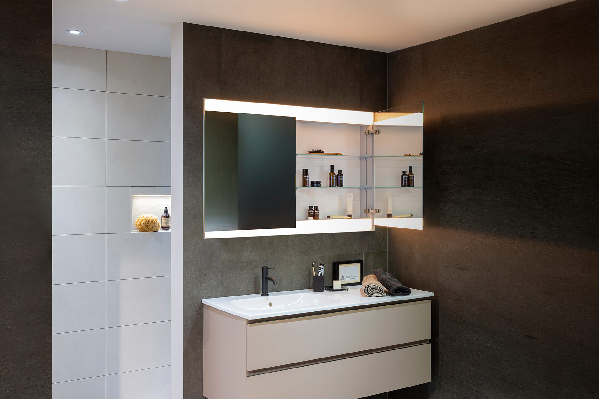 Der Spiegelschrank lässt sich in die Wand einbauen und steht weniger vor. - Stufenlose Glasablage