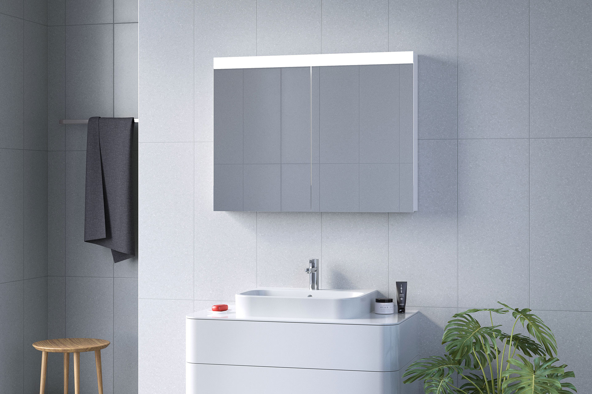 L’armoire-miroir peut être encastré dans le mur et ressort moins. - Étagère en verre continu