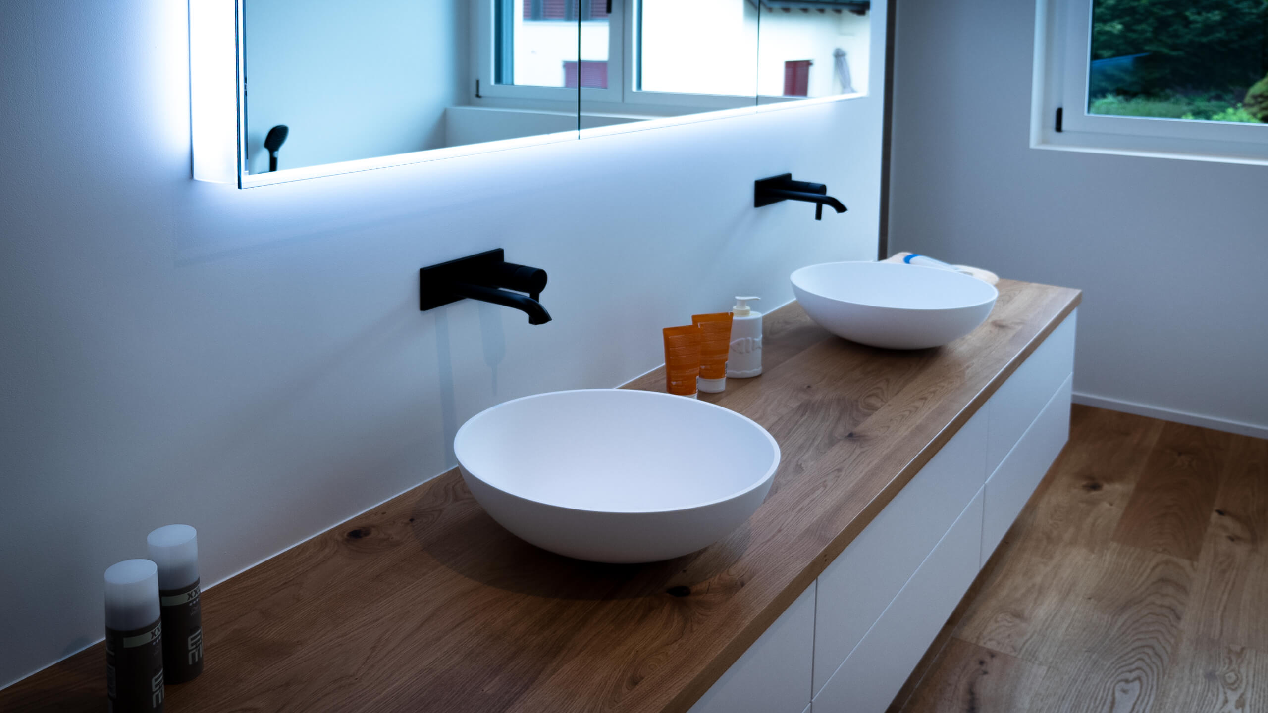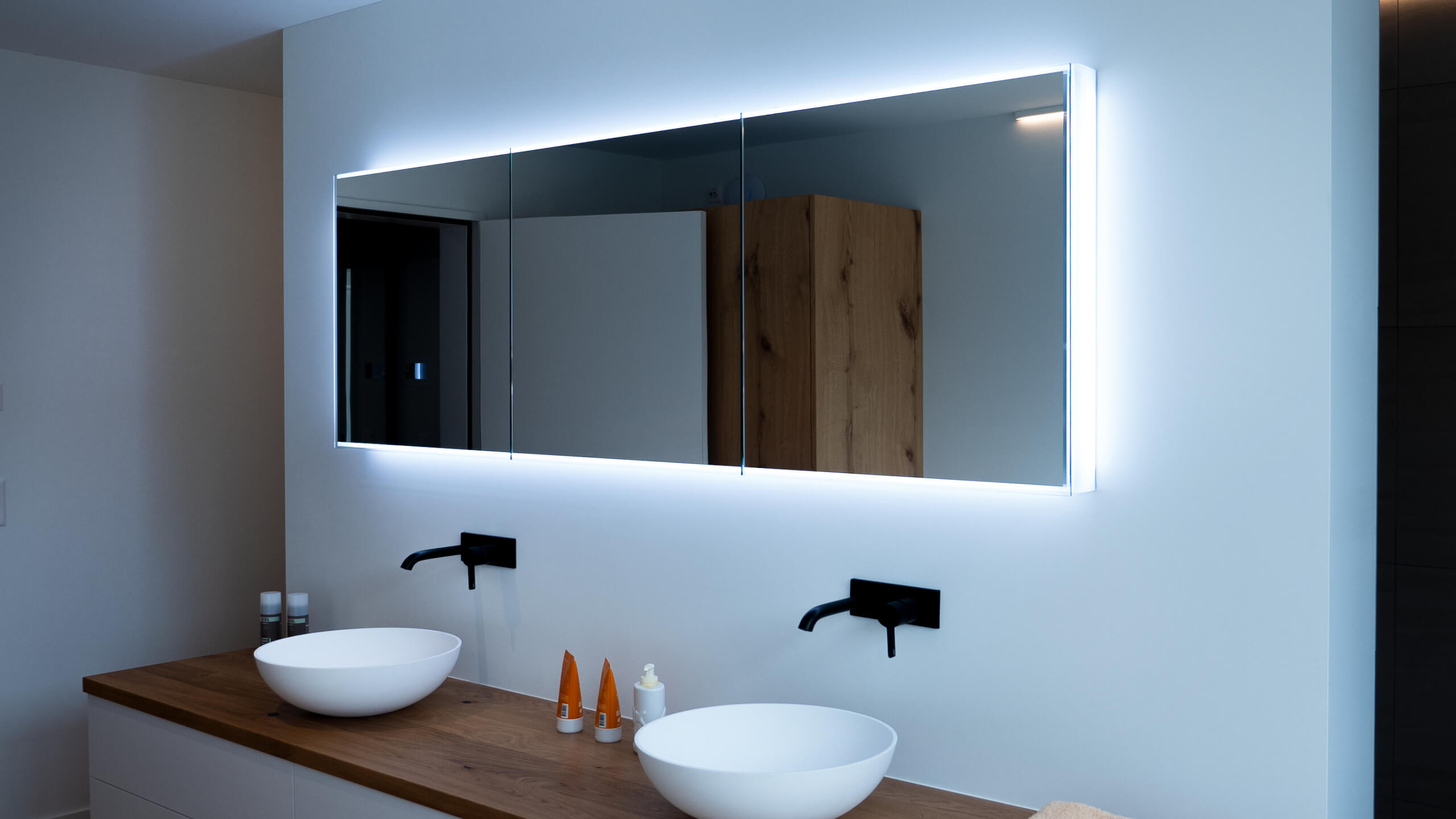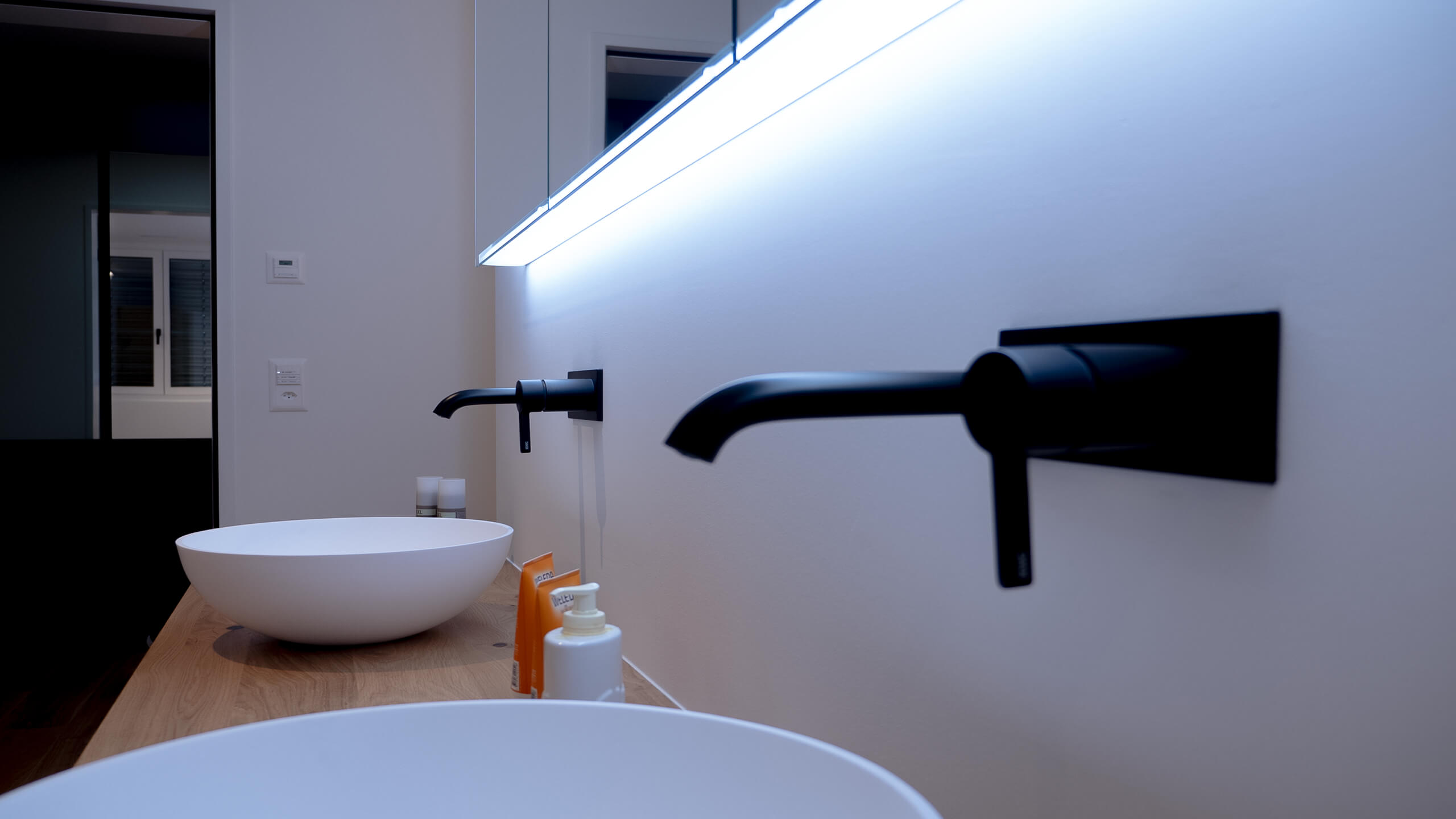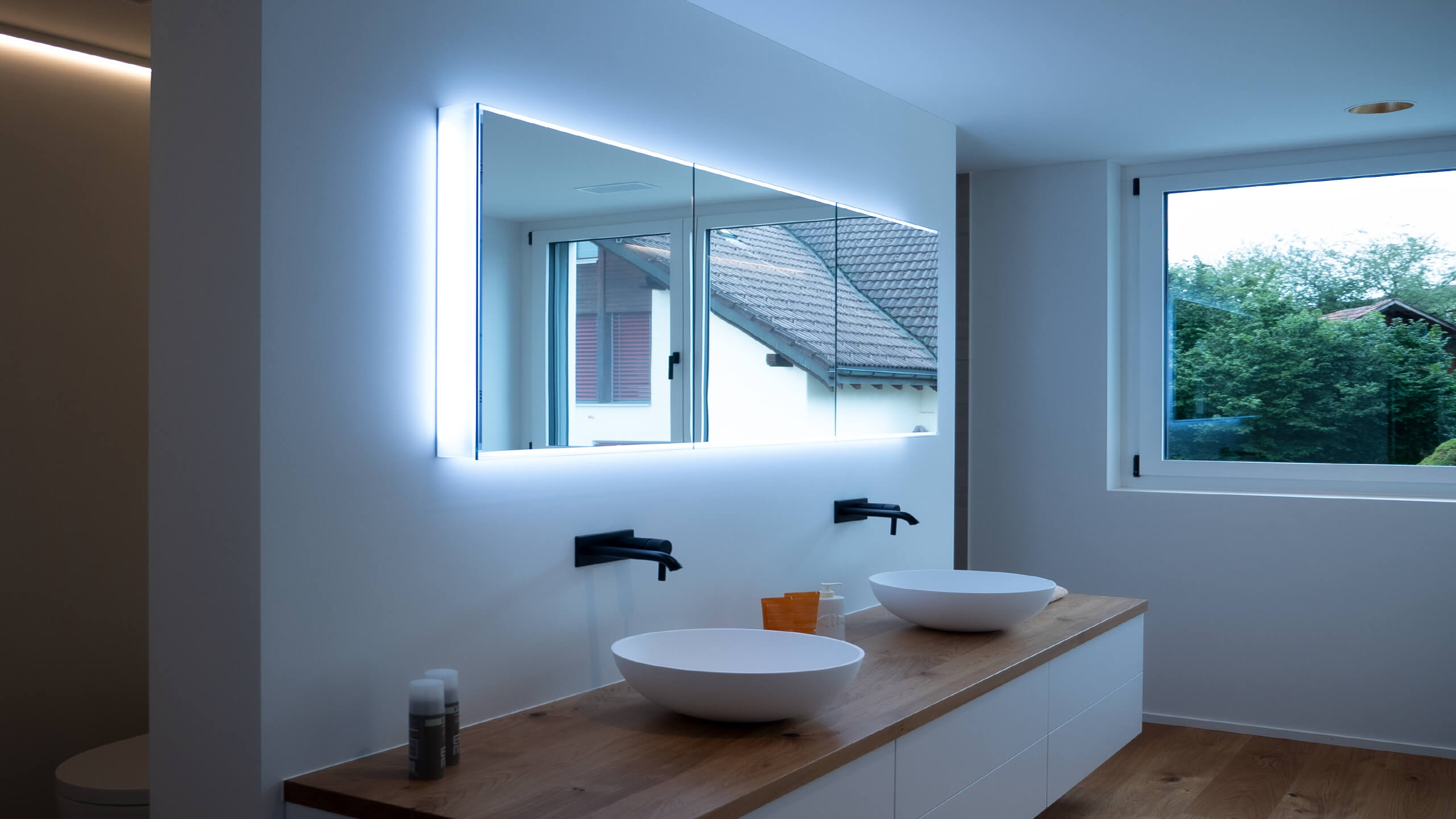 Le bain dans cette maison individuelle est équipée de notre armoire-miroir Schneider PREMIUM Line Superior TW.