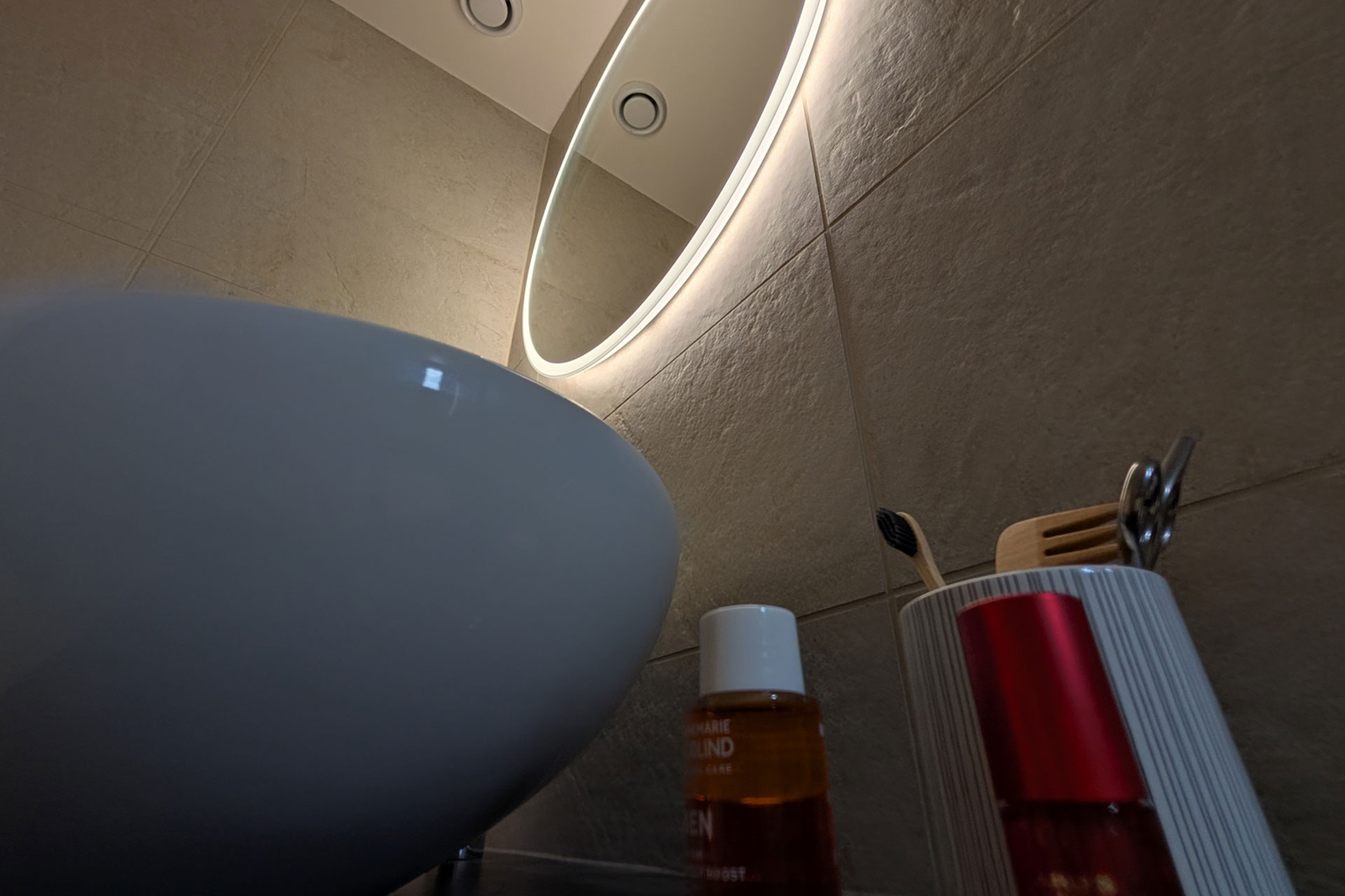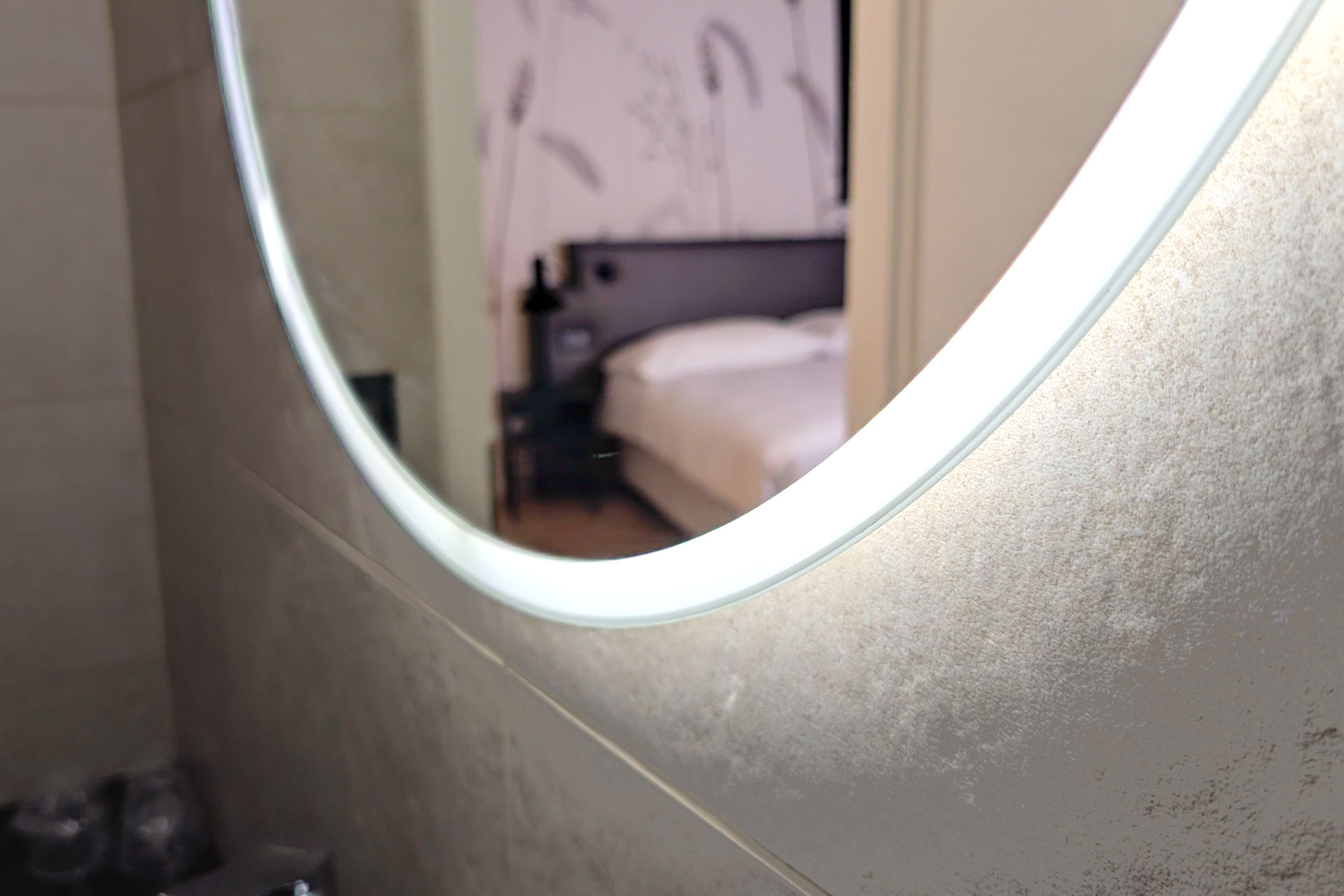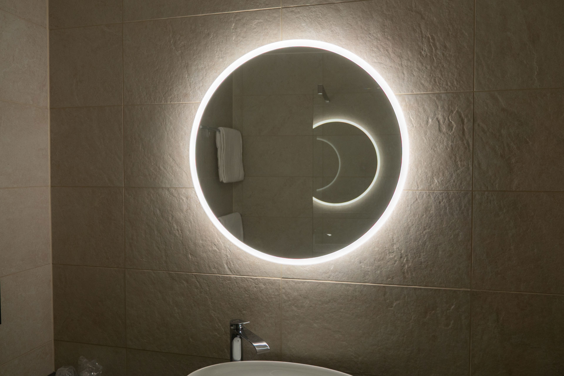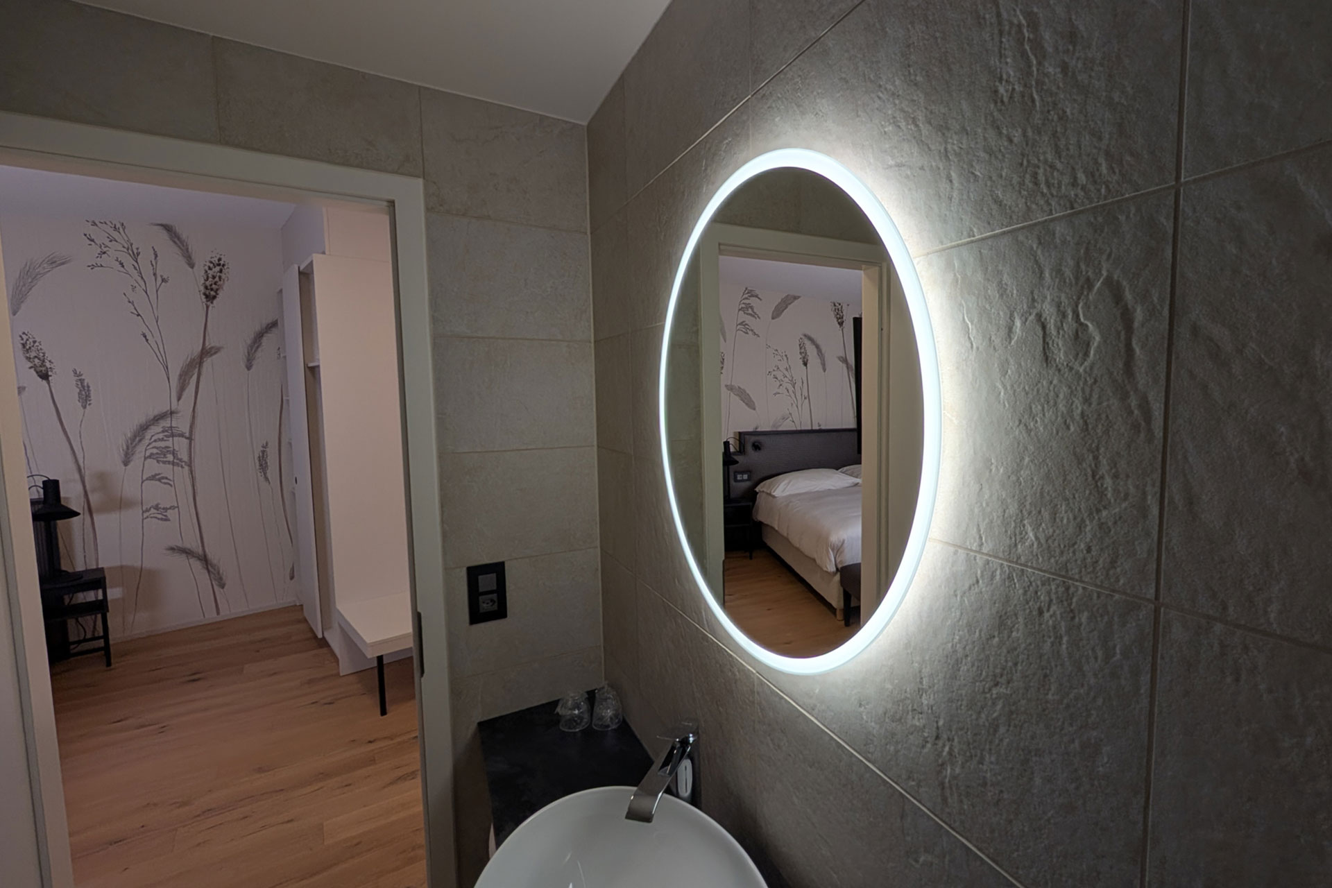 Miroir lumineux moderne dans la salle de bain d’hôtel : le Schneider GLOW LED en action