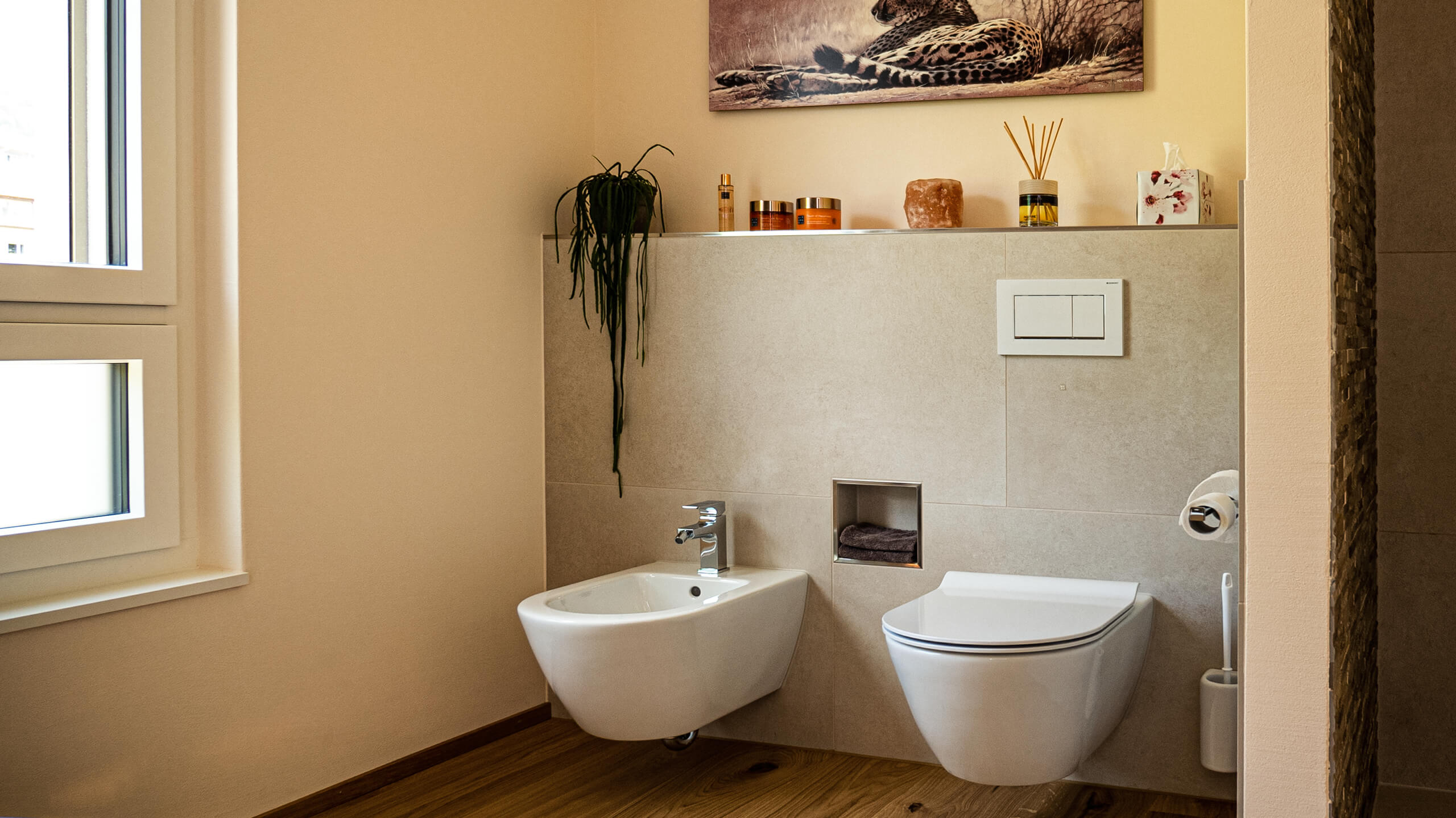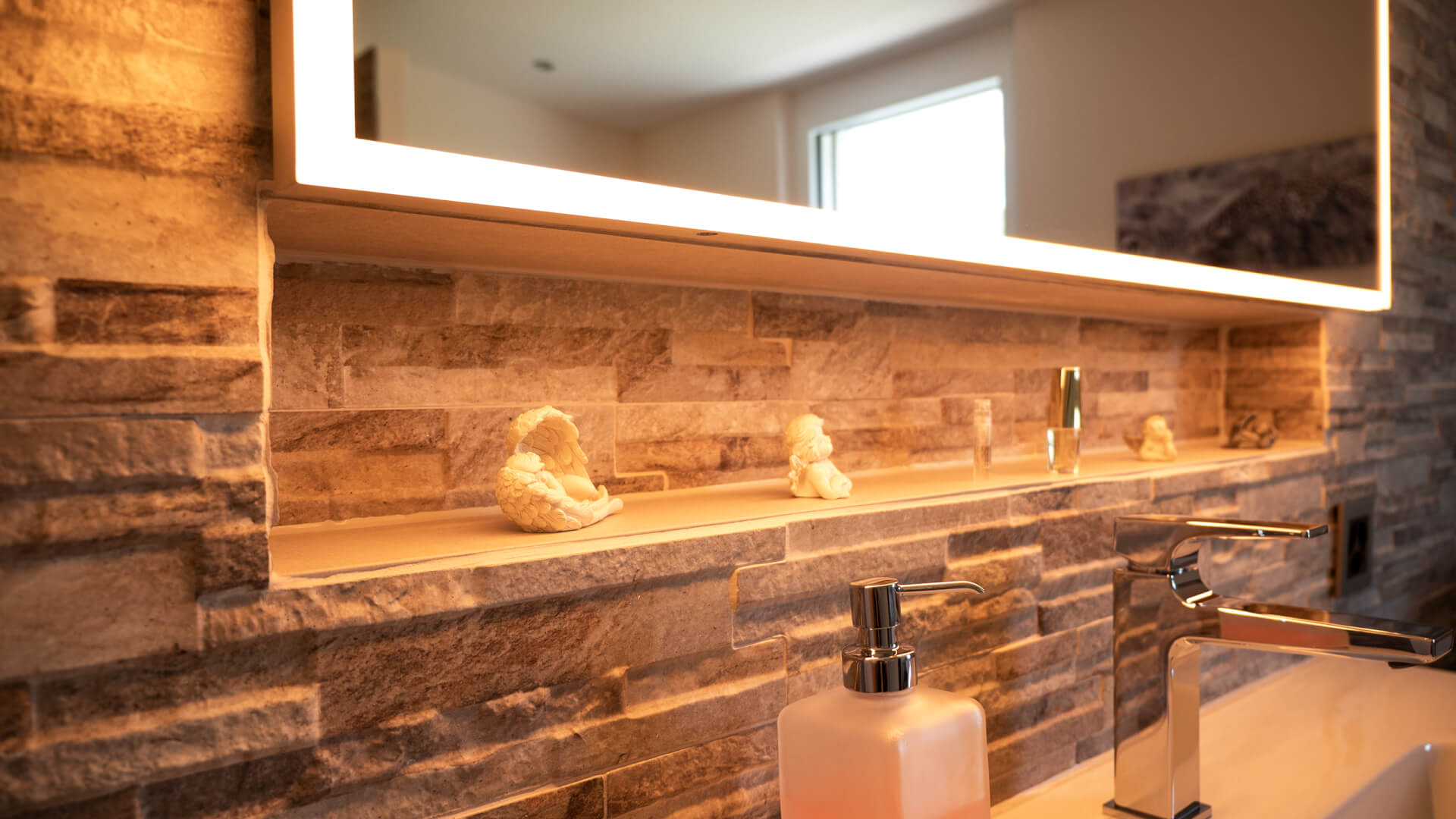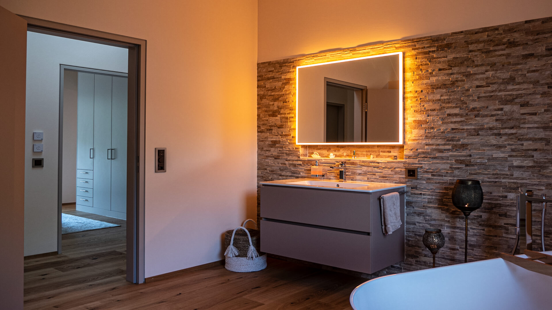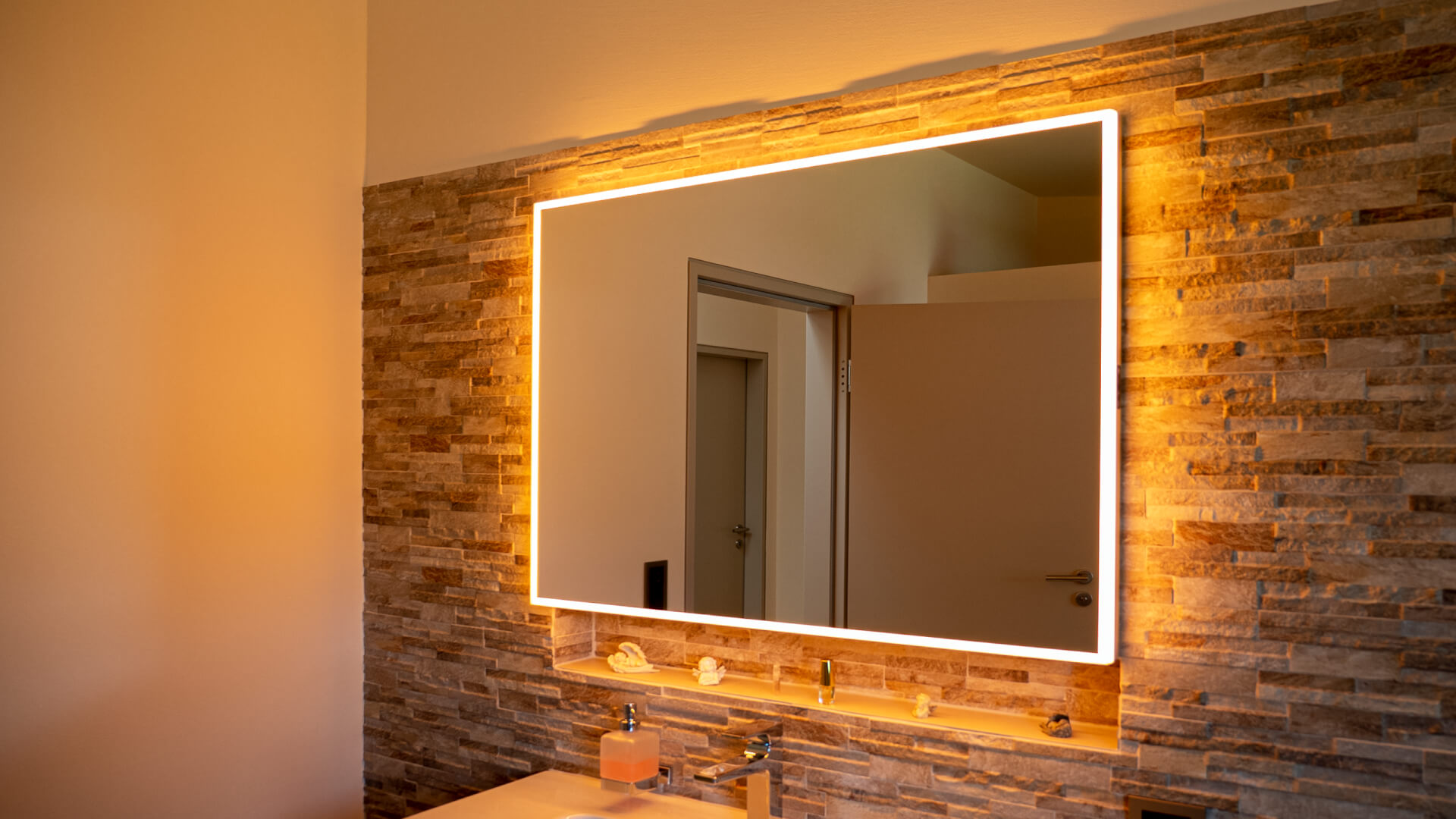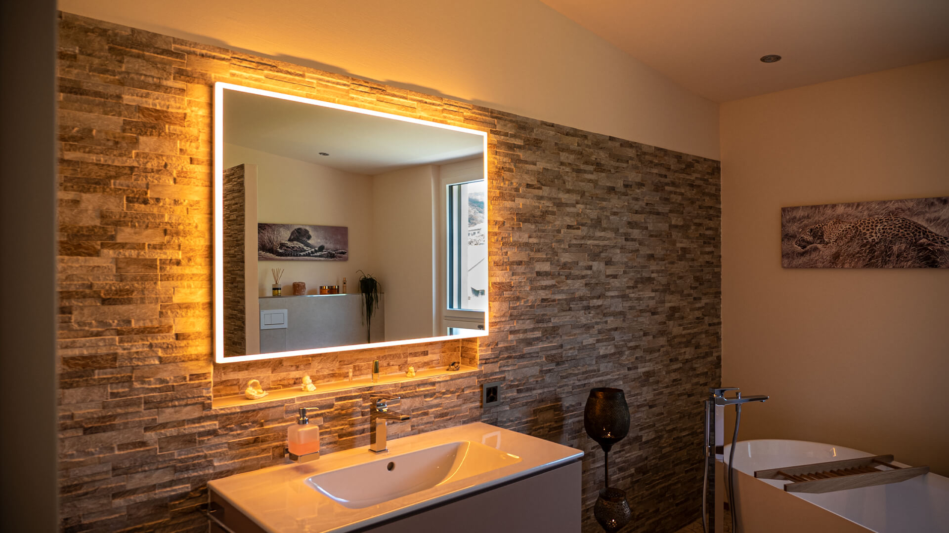 La salle de bains et l’entrée de cet appartement sont équipées de nos miroirs lumineux Schneider A-Line et encadrées d’une fine bande lumineuse. Des LED de grande qualité et diverses fonctions d’éclairage garantissent un bien-être absolu.