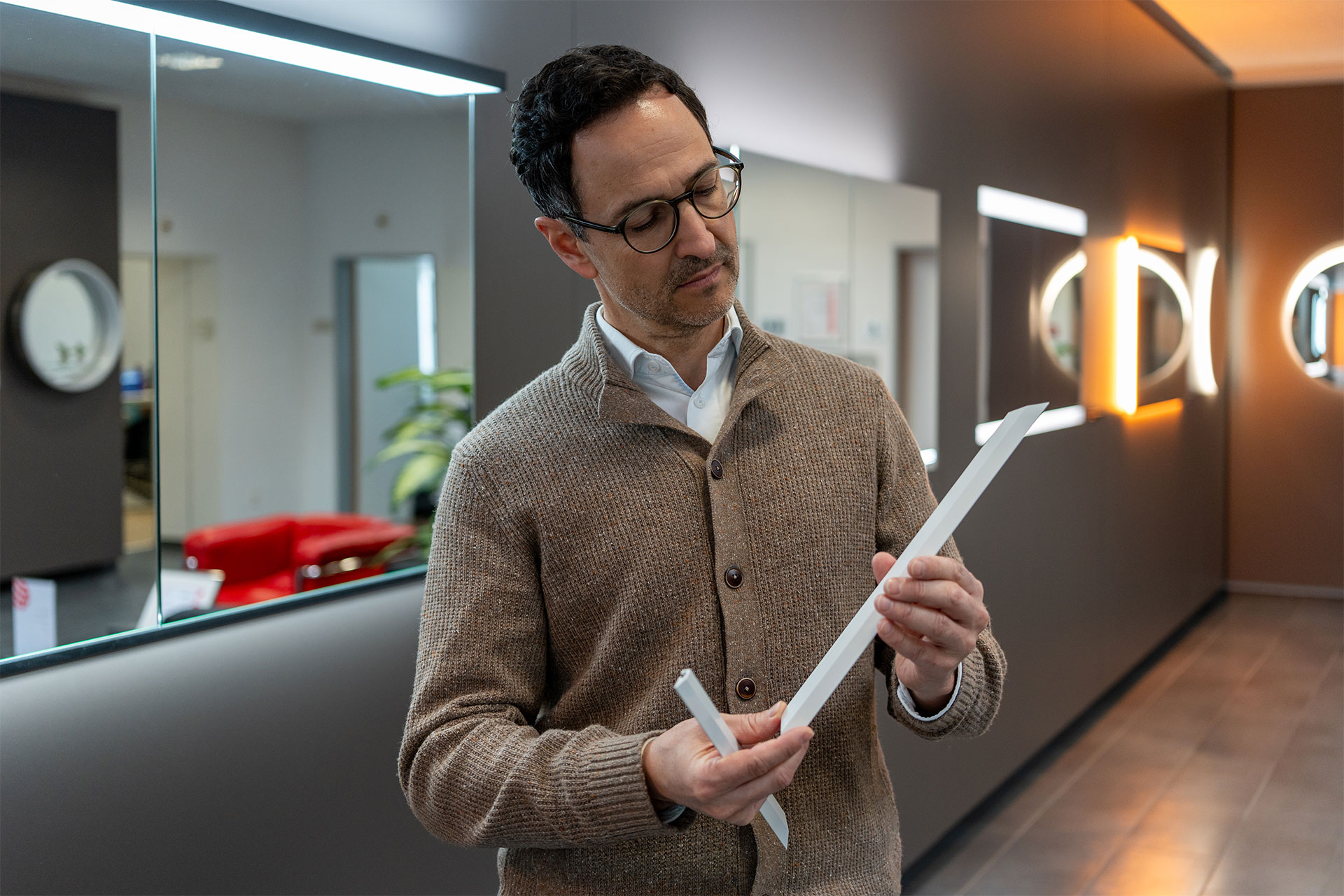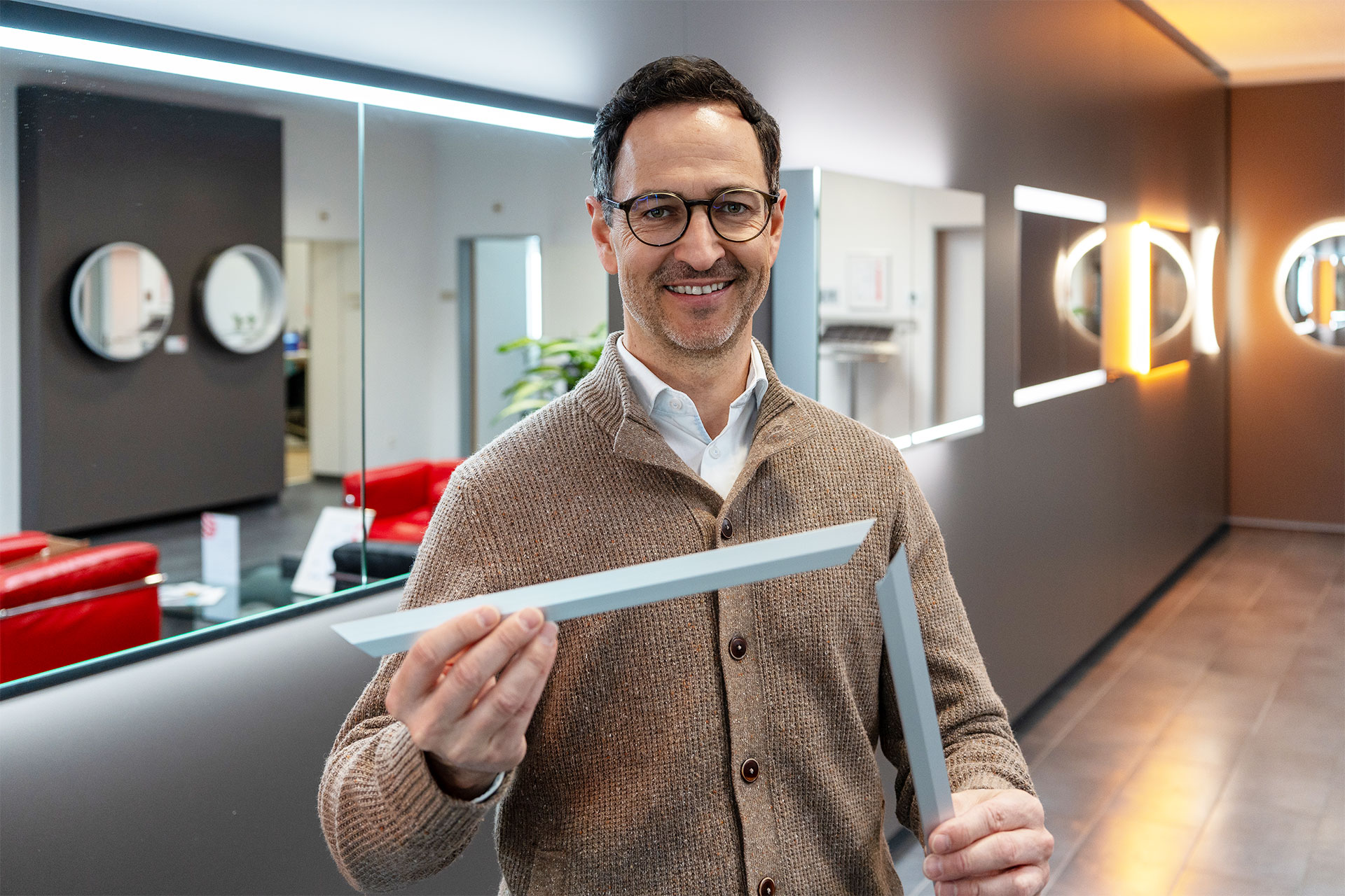 Nel video, Dominik Huwiler mostra come la sottile cornice in alluminio riciclato faccia sparire piccoli difetti in un batter d'occhio. Guardate la cornice di copertura nelle sue diverse varianti e scoprite di più sulla sua facilità di integrazione.
