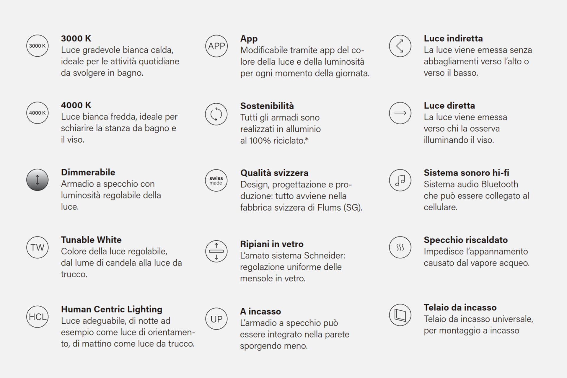 - Le luci dimmerabili dell'armadietto a specchio creano una luce morbida e rilassante la sera, rinfrescando e attivando la temperatura di colore della luce diurna al mattino