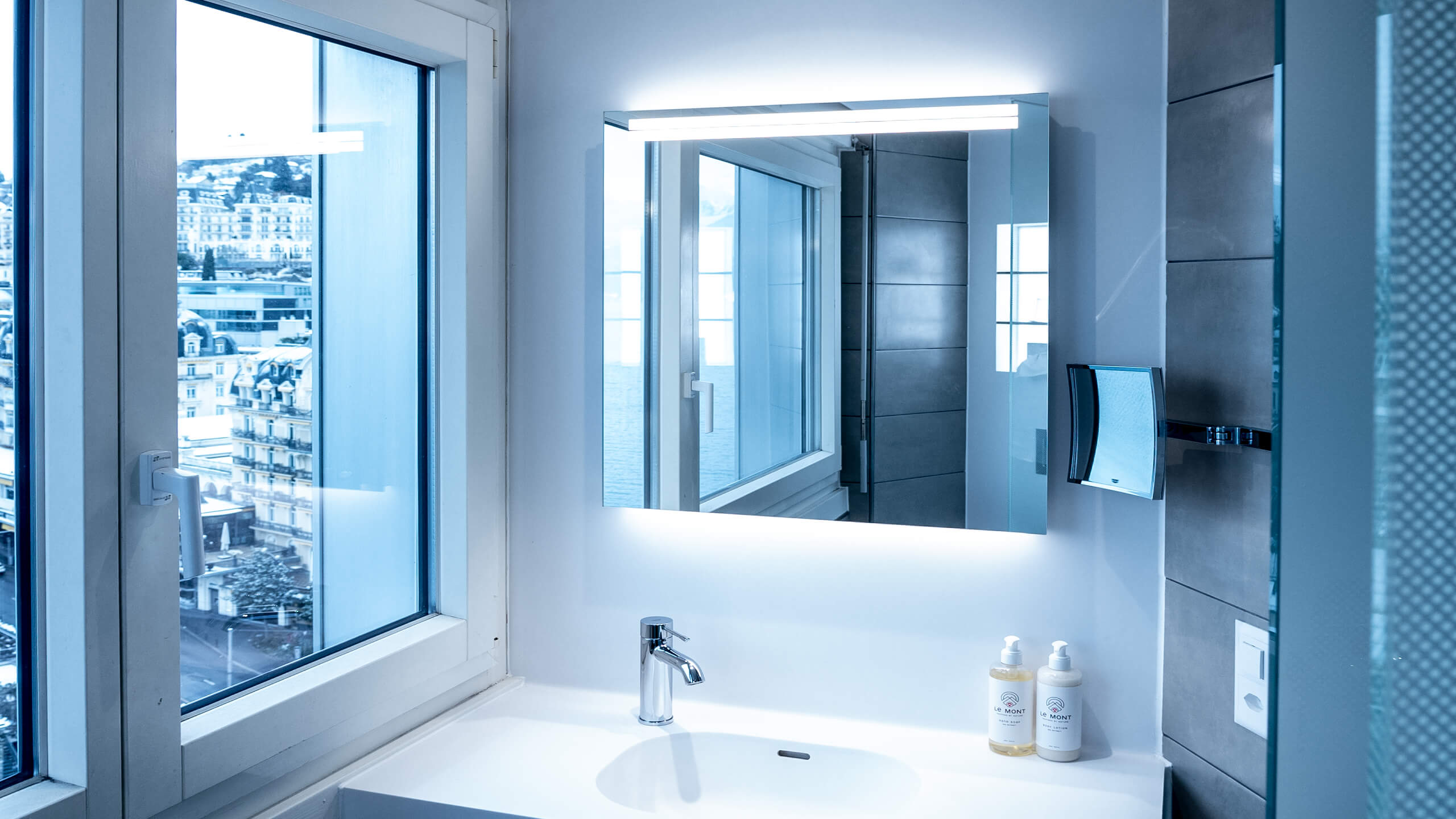 All rooms in this modern and upscale city hotel on the shores of Lake Geneva are equipped with our Schneider ARANGA LED illuminated mirror.